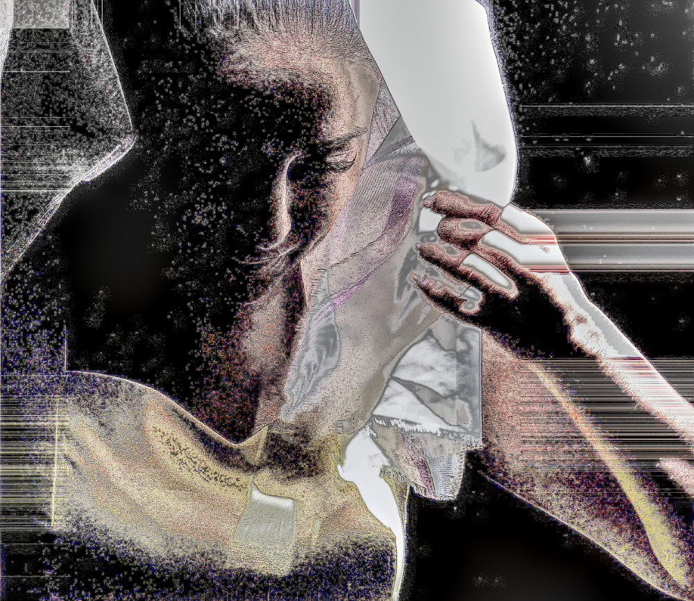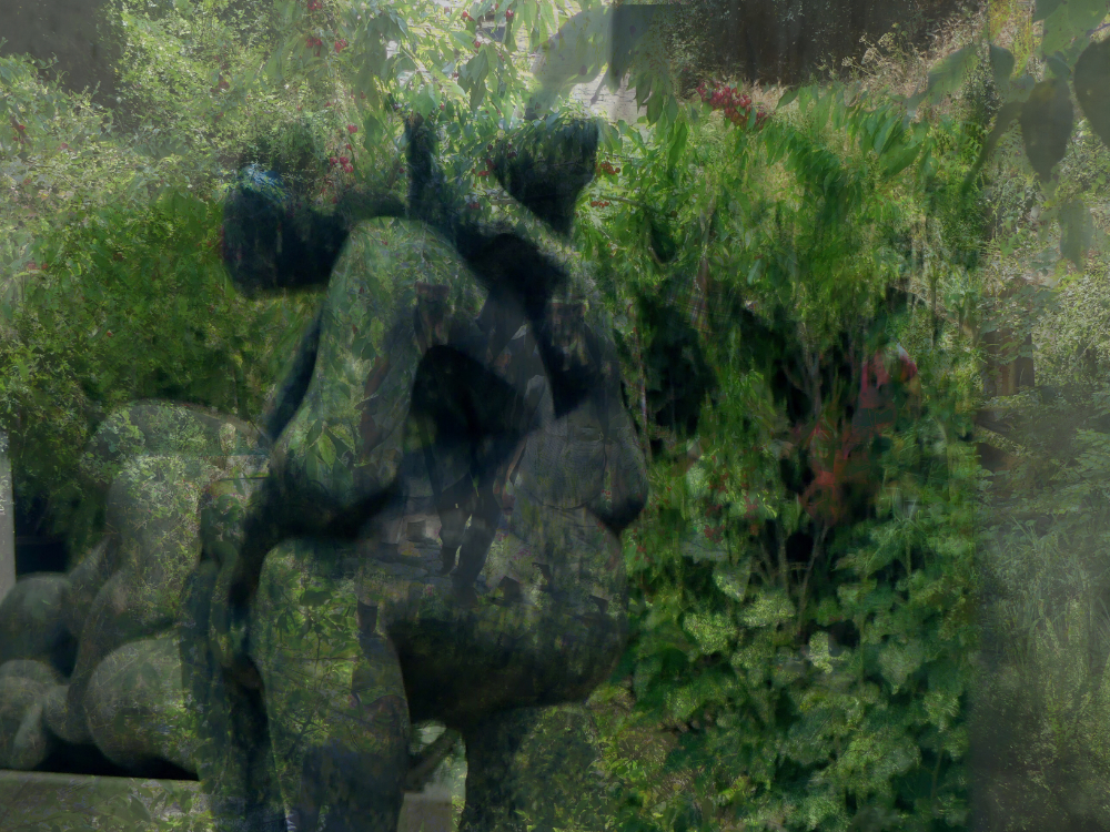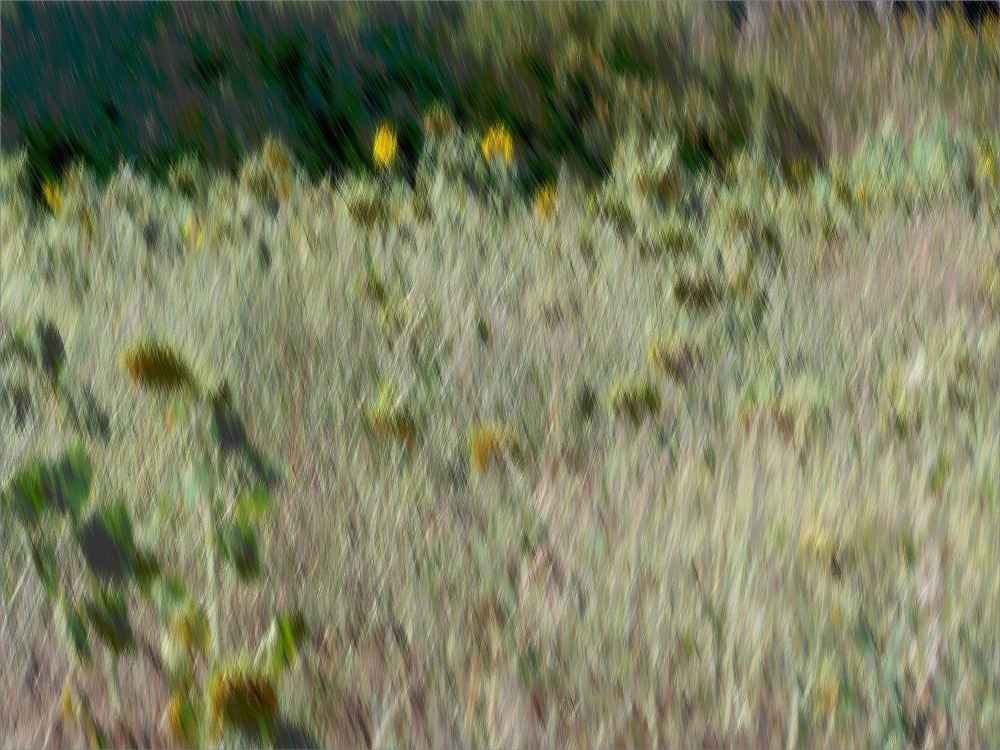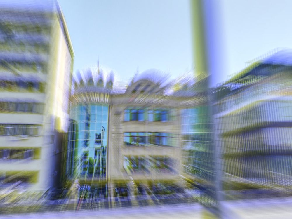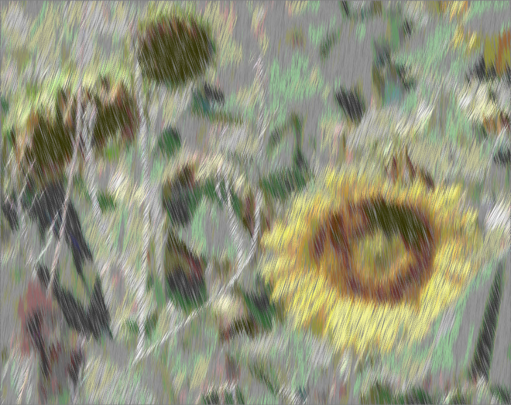 Ich habe nun Stuhl auf Tisch fotografiert. So ist der erste Teil dieser Ausstellung auch Gegenständliches. Im zweiten Teil habe ich die Bilder stark verfremdet, die Dummheit sozusagen kaschiert. Diese Bilder überwinden die Dummheit, indem sie nicht mehr so richtig den Stuhl auf dem Tisch zeigen, sondern Farbenchaos, Verzerrungen, Überlagerungen, einfach nur Farbe und Strukturen.
