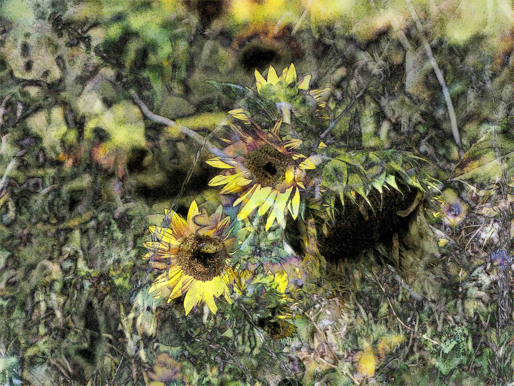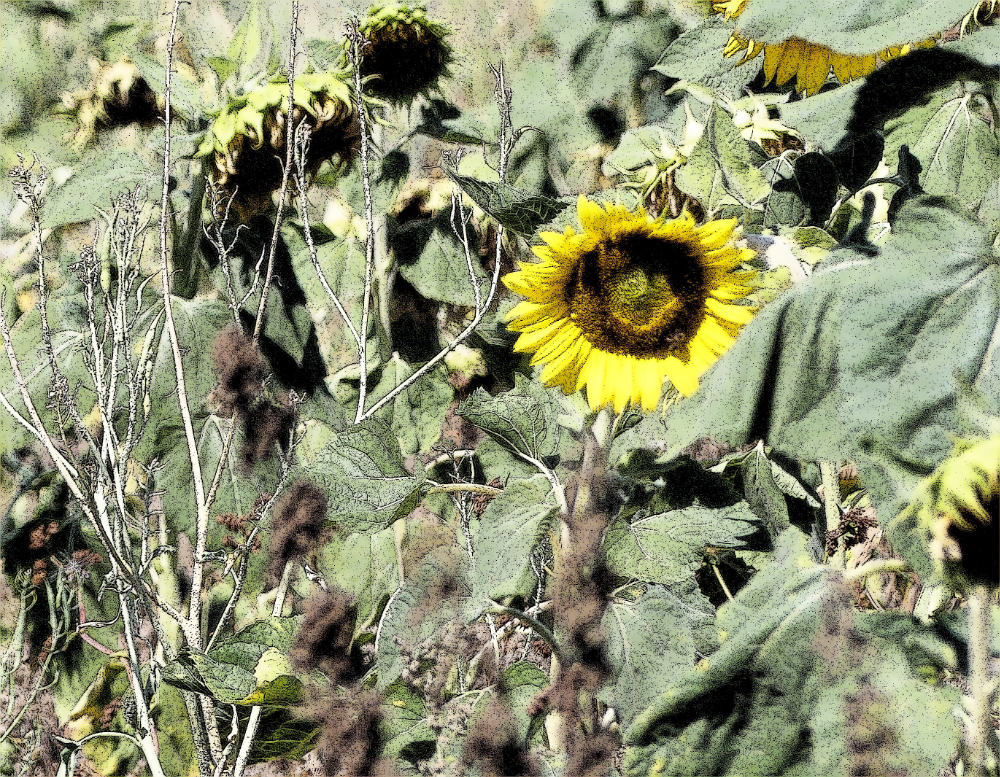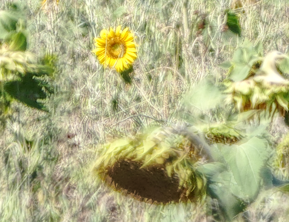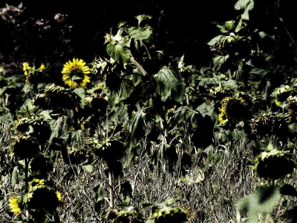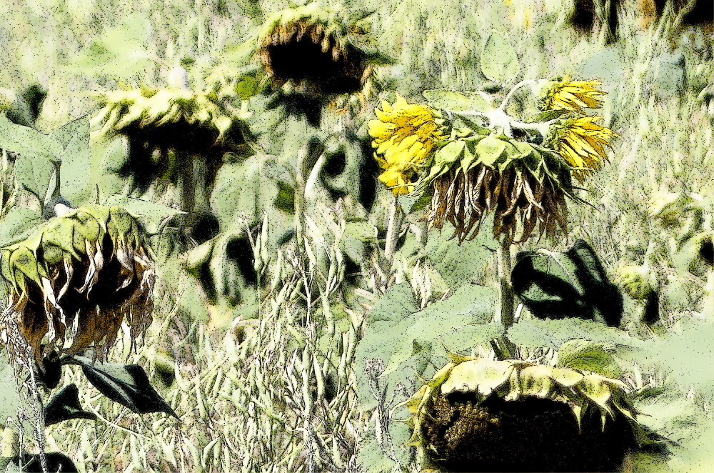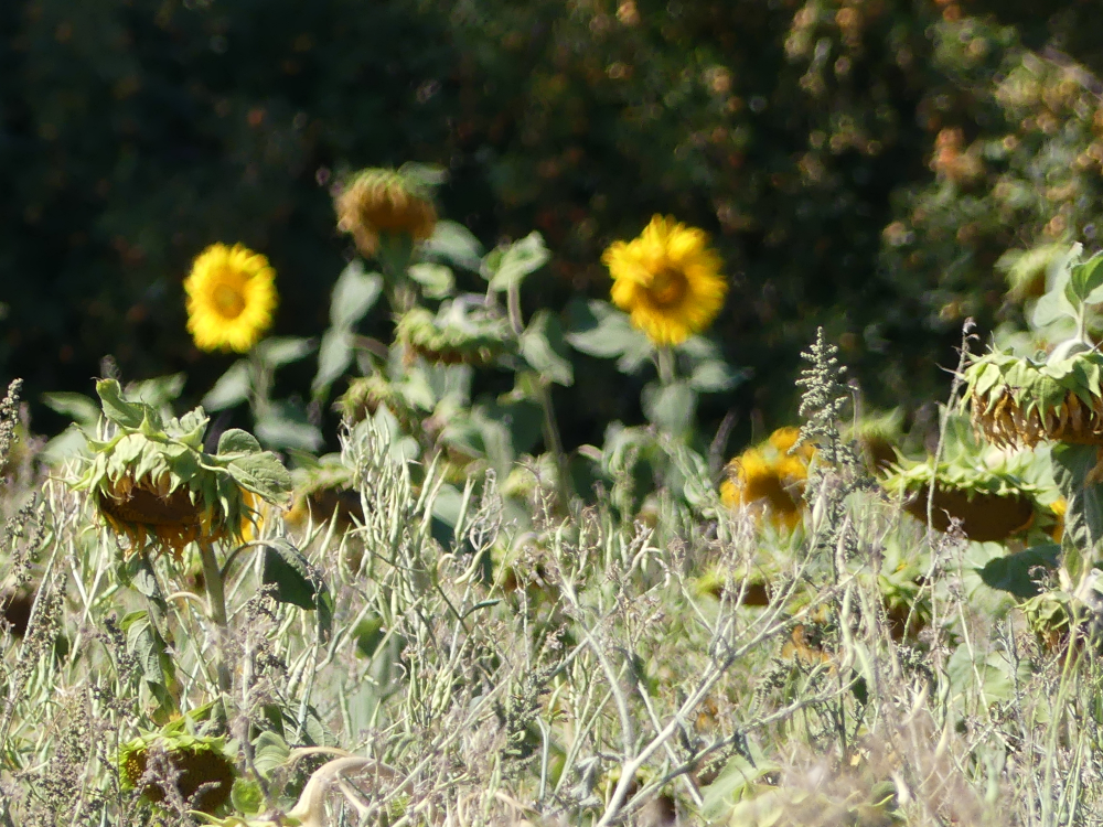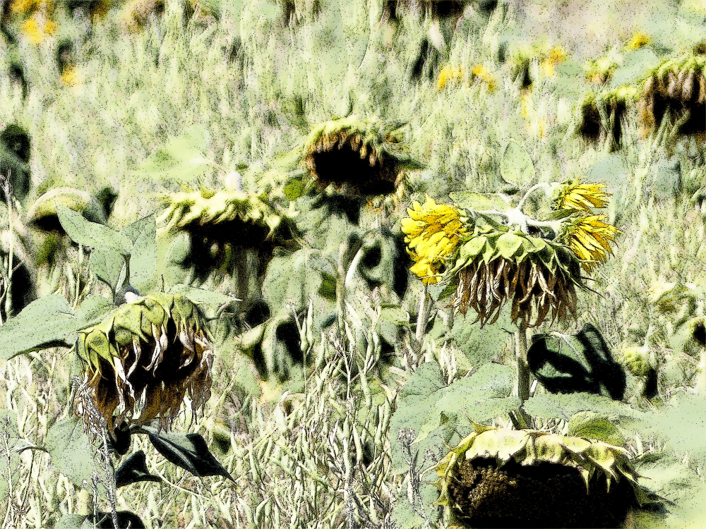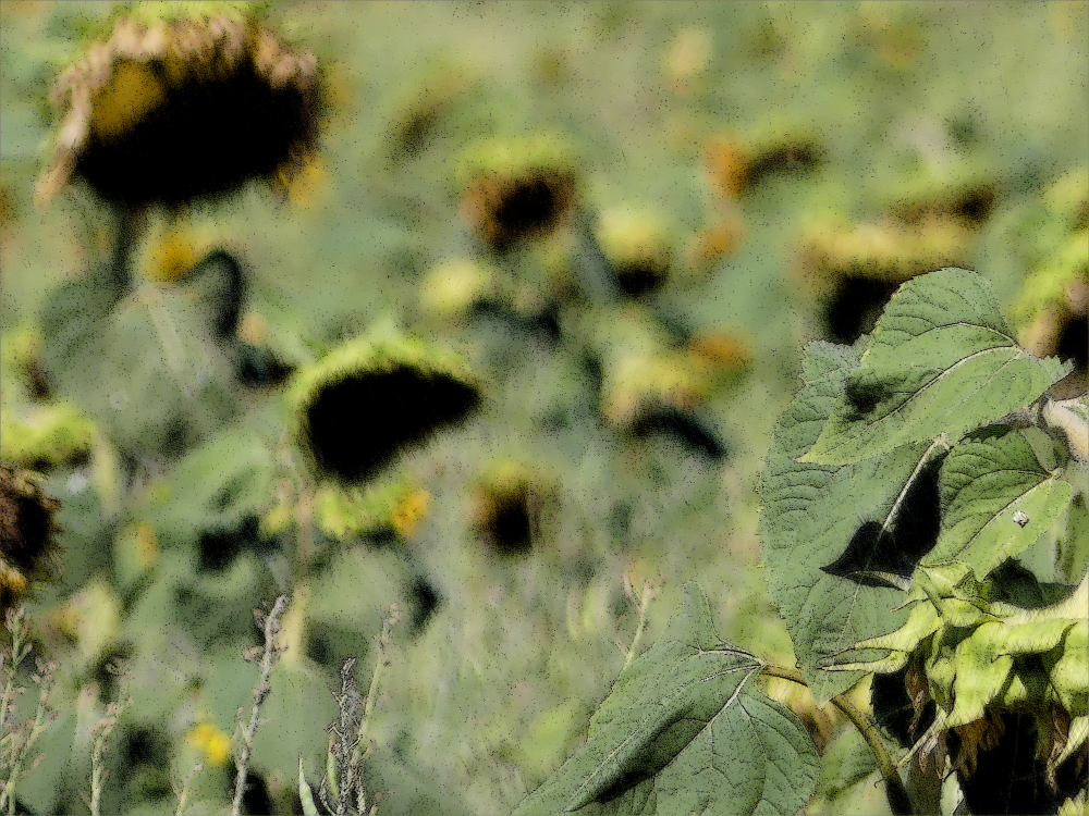 Im August beginnt der Herbst. Besonders gut kann man dies an den Feldern der Sonnenblumen erkennen. Im Sommer stehen sie prächtig in Reih und Glied, aufrecht und entschlossen, ihren Blütenkranz der Sonne entgegen reckend. Dann verlieren sie so allmählich ihren Glanz. Die Blüten neigen sich. Der Betrachter hat den Eindruck, dass die Blumen ihre Köpfe hängen lassen. Gerade bei den Sonnenblumen hinterlässt dies einen traurigen Eindruck. Das Leben geht zu Ende. Die Sonnenblumen verlieren ihre Pracht, strahlen nicht mehr, und neigen ihre Häupter zur Erde hin. Auf mich wirkt dieser morbide Charme mit einer großen Anziehung. Gerade der Verfall steht für sehr schöne Stimmungsbilder. Einige davon habe ich hier abgespeichert.