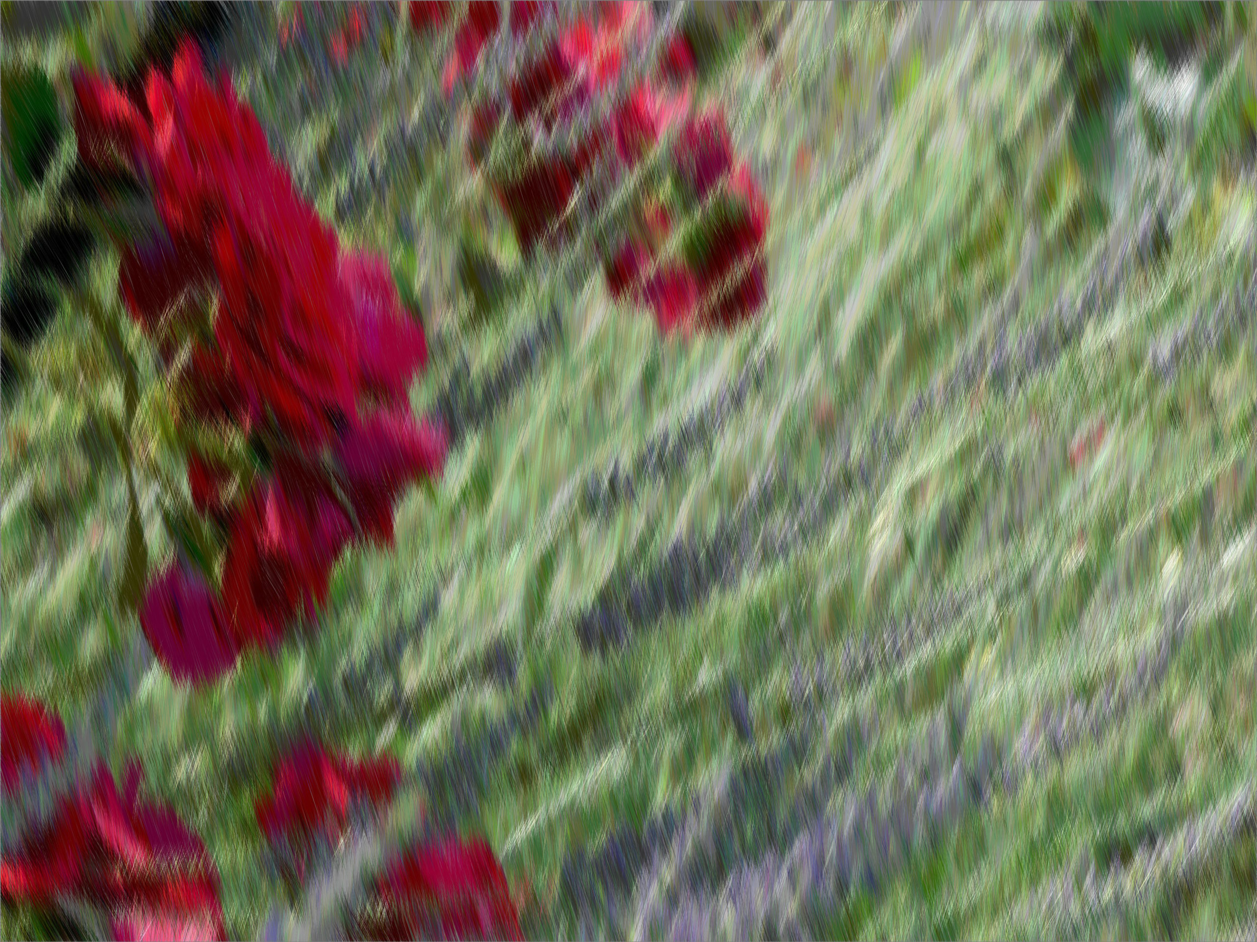 Blumen im Garten. Dieses Jahr besonders schön. Man kann sich an diesen Blumen, der Natur erfreuen. So wie sie ist. Ich bearbeite die Natur. Ich will aus einem natürlichen Bild ein unnatürliches, ein künstliches Bild machen. Es ist vielleicht nicht unbedingt schöner. Aber anders. Mich fasziniert diese andere Sicht der Dinge.